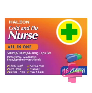 Haleon Cold and Flu Nurse All-in-One capsules provide comprehensive relief from cold and flu symptoms. Each pack contains 16 capsules formulated to reduce fever, relieve aches and pains, ease nasal congestion, and soothe sore throats. Haleon Cold and Flu Nurse helps you feel better quickly and get back to your daily activities.